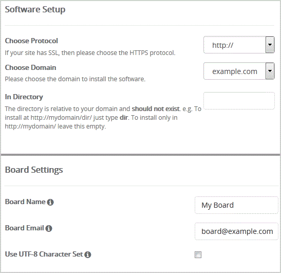 - In Directory: If you want to install this in a directory, for example example.com/forum, enter the directory name. Otherwise, leave this blank to install in your main domain example.com