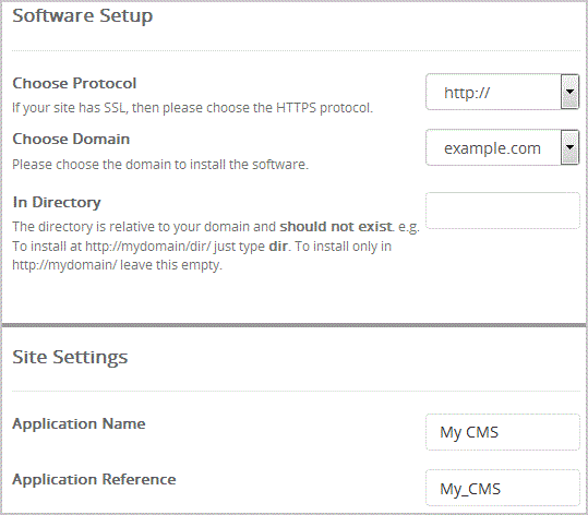- In Directory: If you want to install this in a directory, for example example.com/directory, enter the directory name. Otherwise, leave this blank to install in your main domain example.com