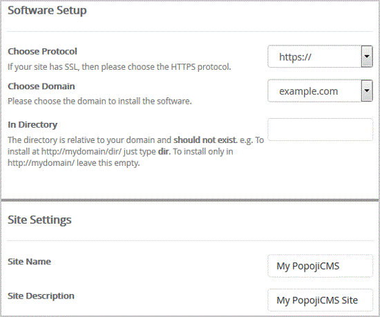 - In Directory: If you want to install this in a directory, for example example.com/directory, enter the directory name. Otherwise, leave this blank to install in your main domain example.com