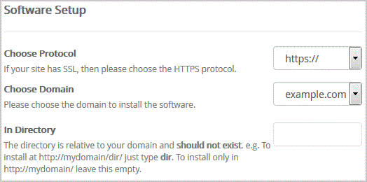 - In Directory: If you want to install this in a directory, for example example.com/directory, enter the directory name. Otherwise, leave this blank to install in your main domain example.com