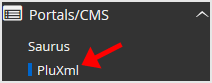 . On the left side of your screen you should locate the "Portal/CMS" category. Click on it and then. "PluXml" link that will appear.